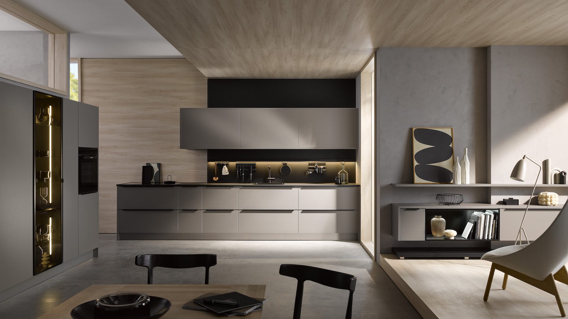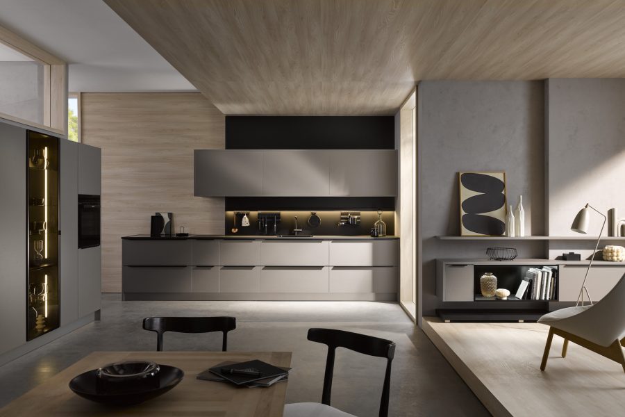 der Hochschrankzeile in Seidengrau – es dominieren geometrische Formen und