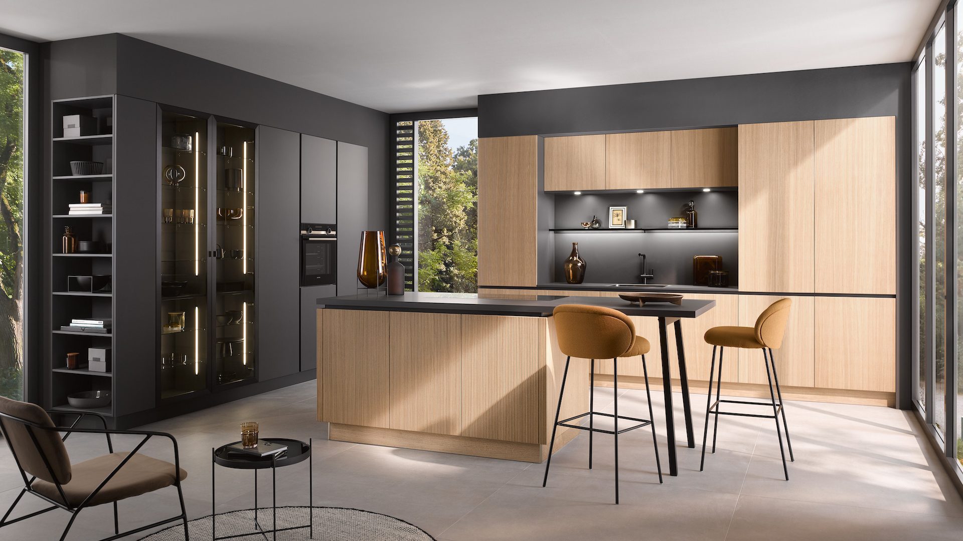 Der warme Holzton Feineiche-natur prägt den Look der Küche ohne zu