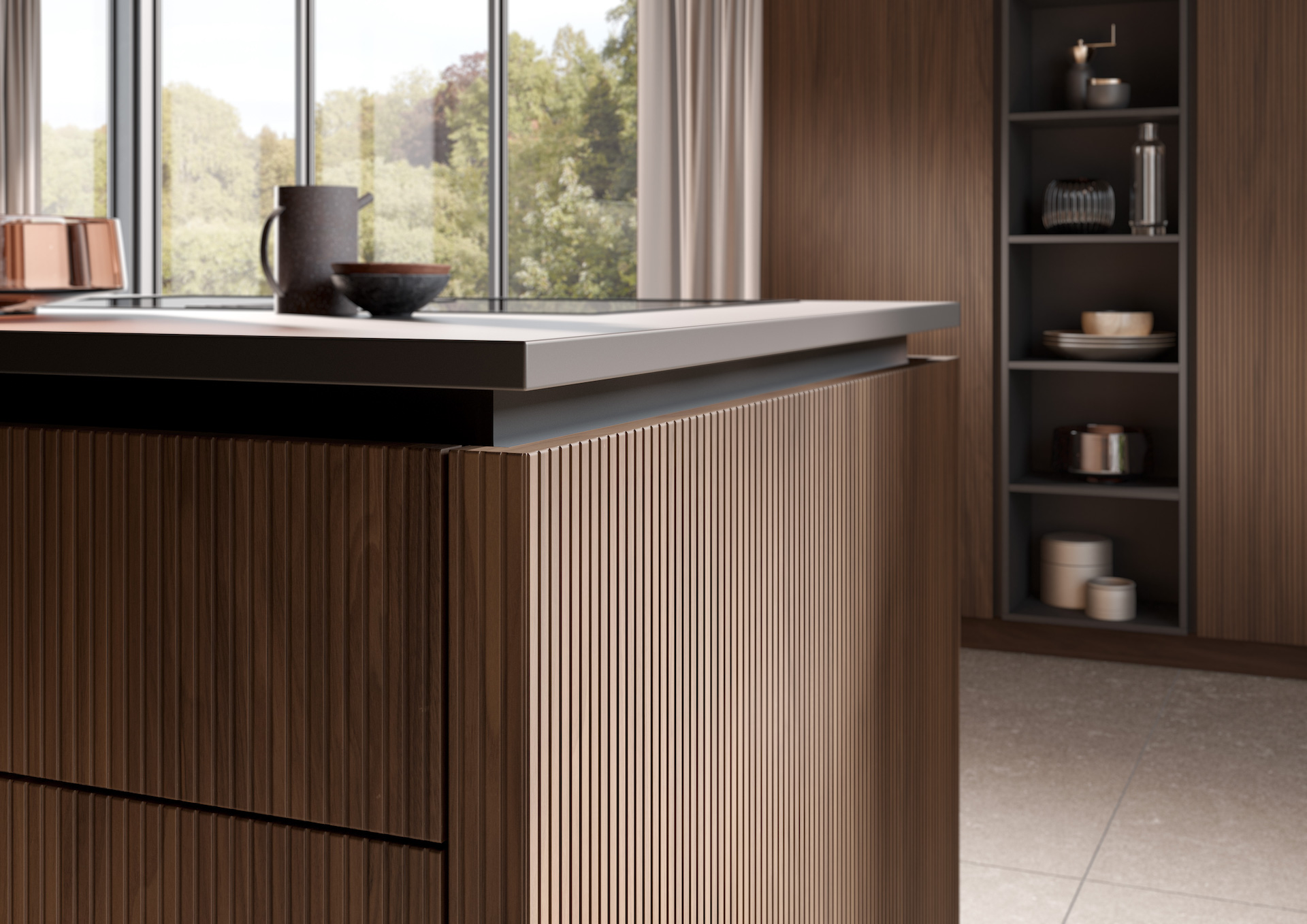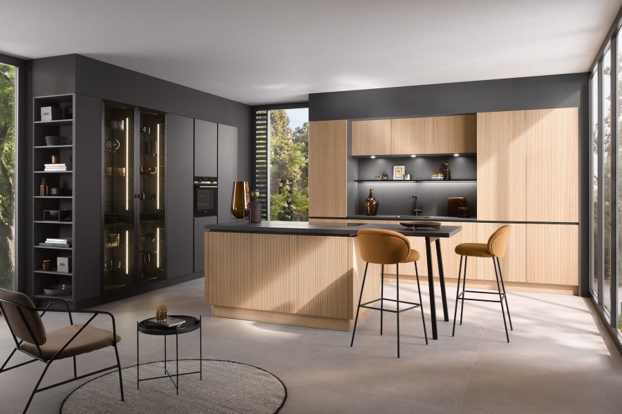 Design auf ganzer Linie – hier begeistert die hochwertige Holzfront im Rillendesign ebenso wie die gesamte Architektur der Küche. Die funktionalen Bereiche sind fast unsichtbar in der Kücheninsel und dem quadratischen Hochschrankelement untergebracht. Auflockernde Details: die beiden Glastüren und das deckenhohe Regal.