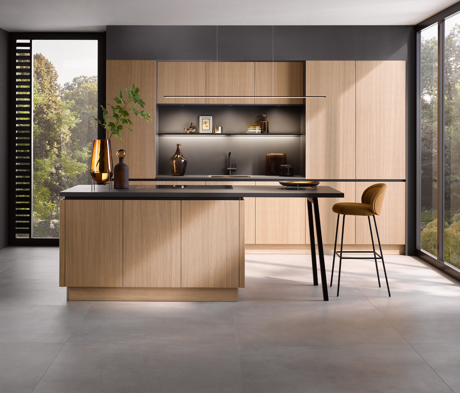 Die gerillte Holzoberfläche lässt keine Wünsche offen. Die edle Kombination von Eiche-elegant und kühlem Graphit macht diese Küche zu einem sinnlichen Minimalisten. Die Fronten in Echtholzfurnier überzeugen mit feiner Linienstruktur und unterstreichen das klare Design zusätzlich. Eine grandiose Küche, die eindrucksvoll zeigt, wie gute Kombinationen gelingen.