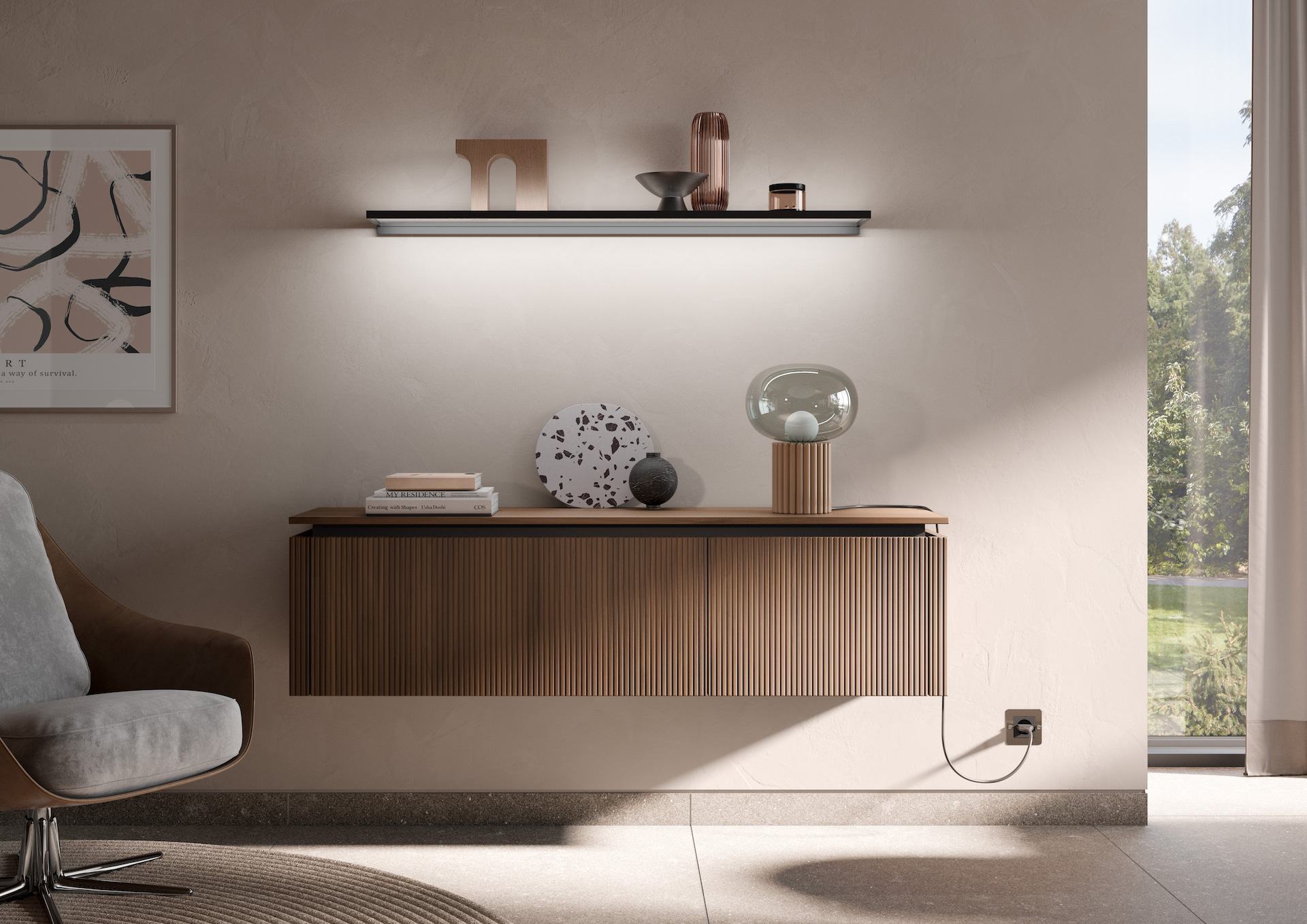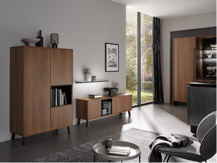 Die furnierte Oberfläche in Nussbaum-elegant rückt die lebendige Holzstruktur in den Fokus. Das Design der Fronten passt hervorragend in eine geradlinige,