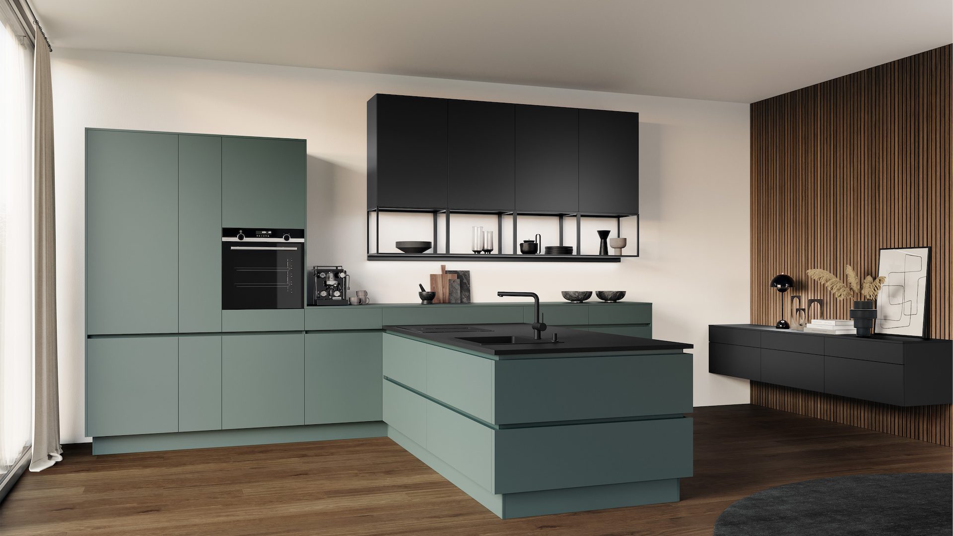 Ob bei der massiven Kücheninsel in Oliv, den wandhängenden Schränken oder