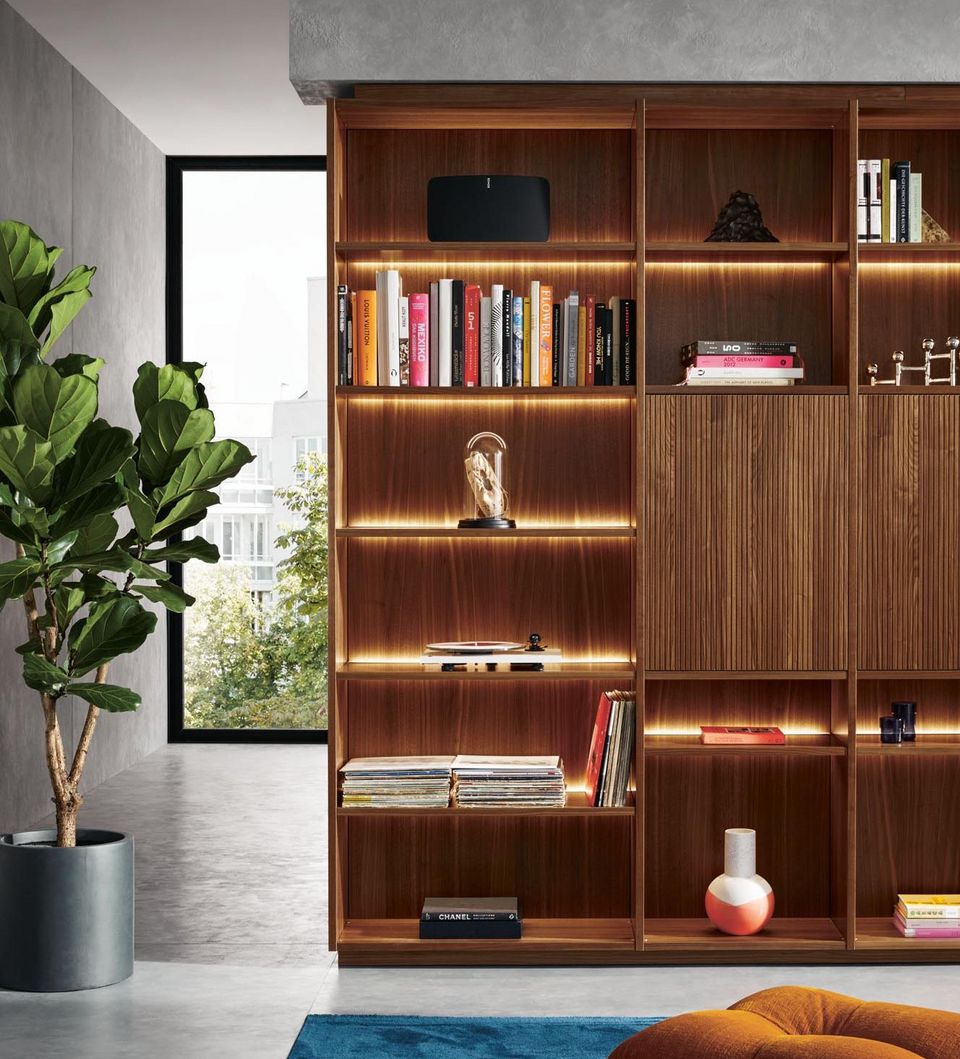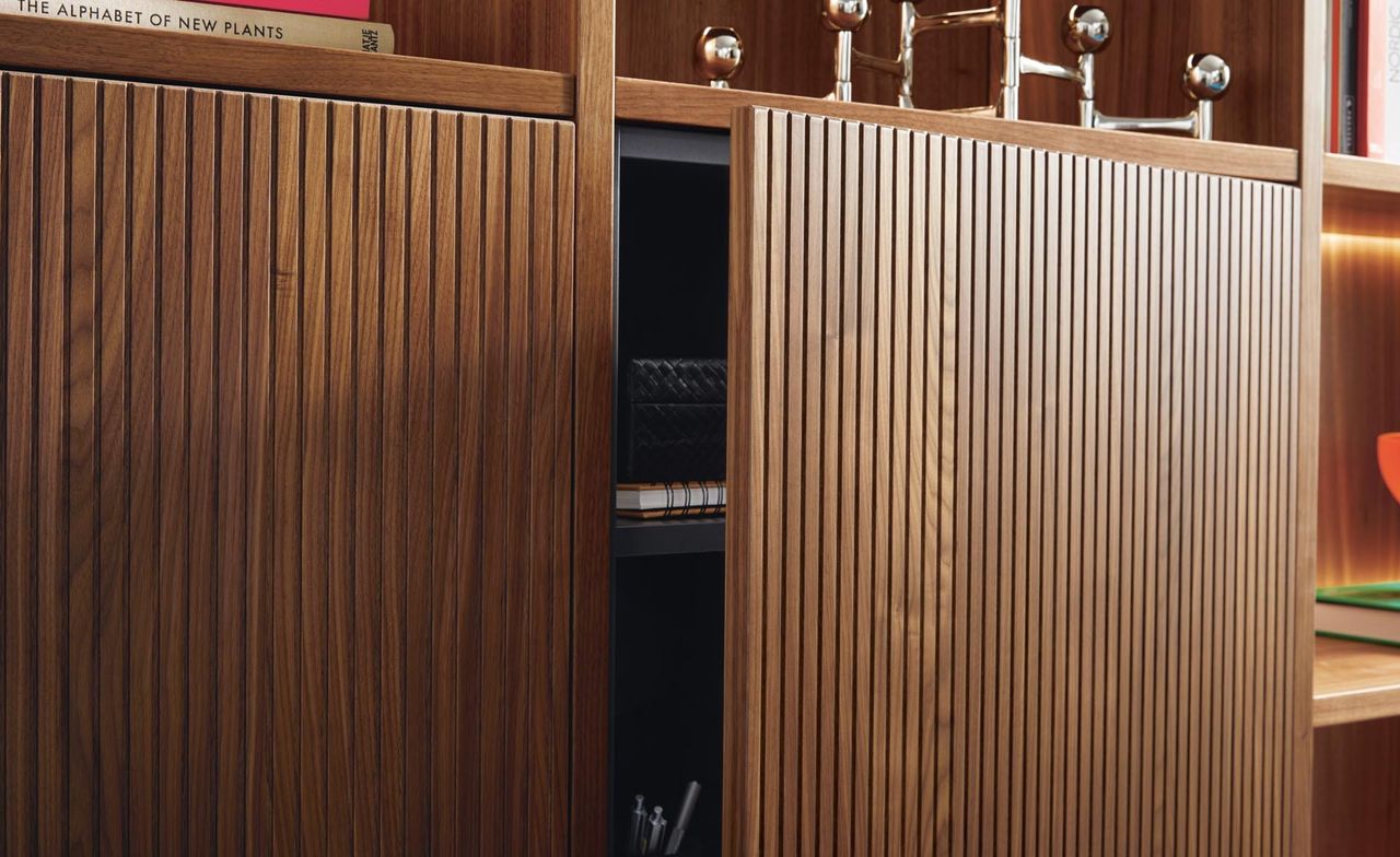 Als Beispiel eine Barlösung die im Wohnbereich integriert ist, abgestimmt auf die Regalwand in dunklem Walnussholz in Rillenoptik.