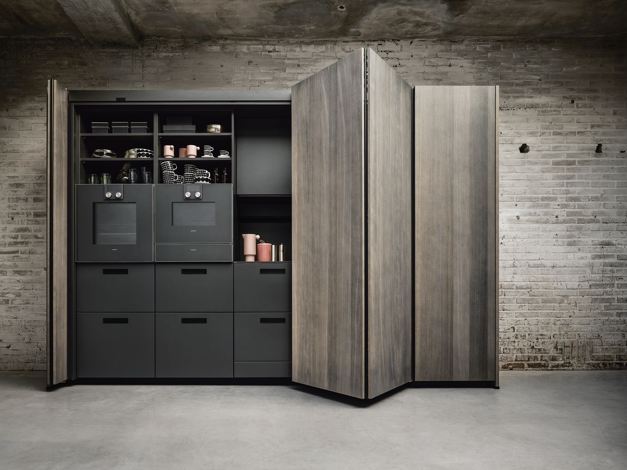Perfekt für alle, die Ordnung lieben: Spüle, elektronisches Equipment und reichlich offener und geschlossener Stauraum verstecken sich in dem doppelten Einschubtürenschrank, der bei Bedarf die Küche verschwinden lässt und für Ruhe im Raum sorgt.