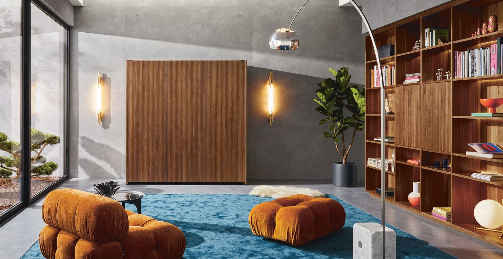 Dahinter ein mit Falttüren zu öffnender Schrank, der die Technik geschickt versteckt und bei geschlossener Front angenehme Ruhe in den Raum bringt.