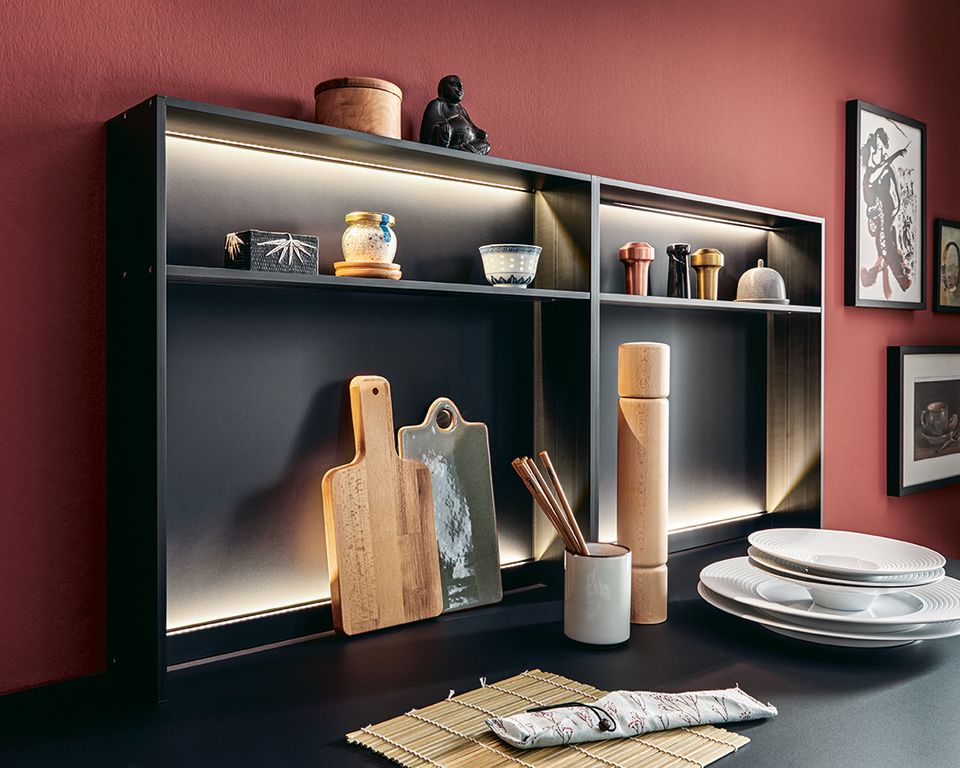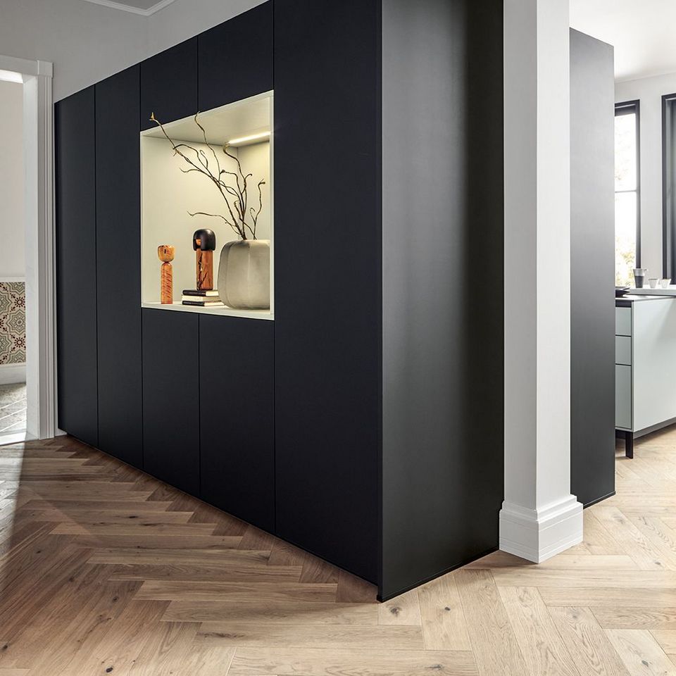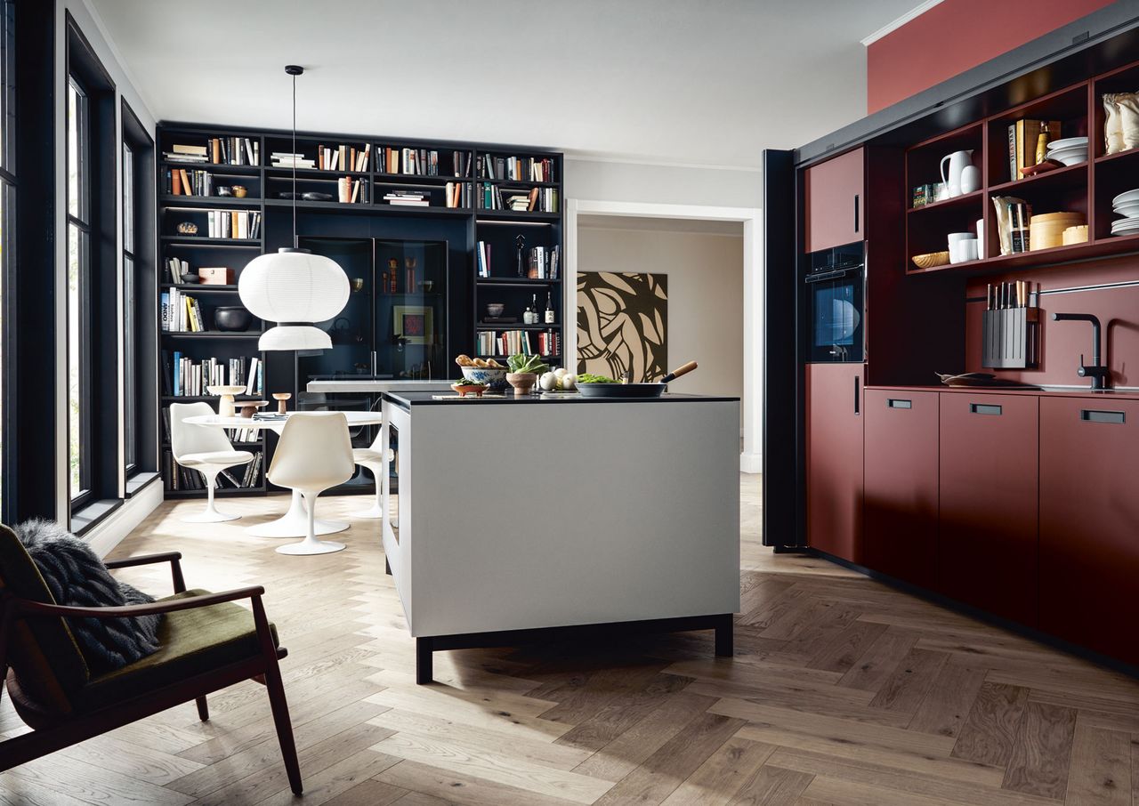 Die Küche mit Fronten in expressivem Indischrot, subtil erfrischt mit einem Akzent in Nebelblau, bietet reichlich Platz zum Arbeiten und Aufbewahren. Auch im angrenzenden Bereich besticht die Einrichtung mit viel Stauraum für alles, was Liebhaber der schönen Dinge brauchen.