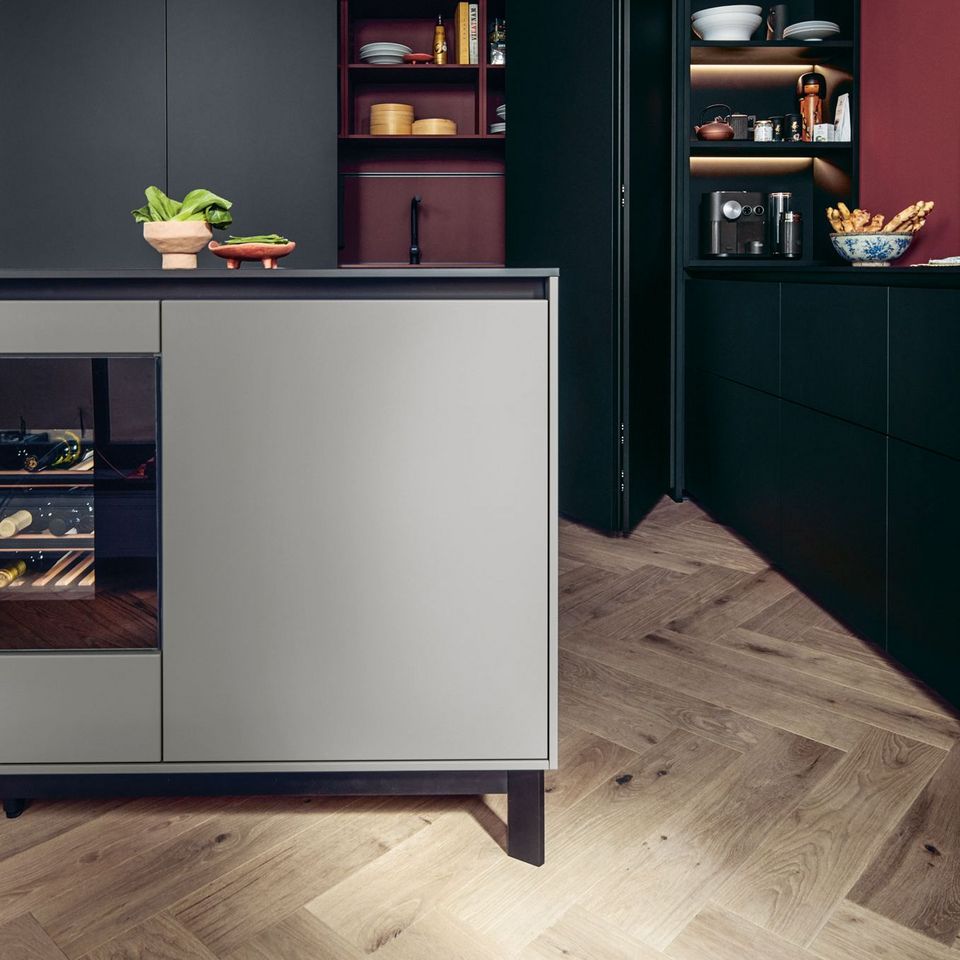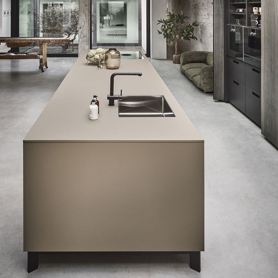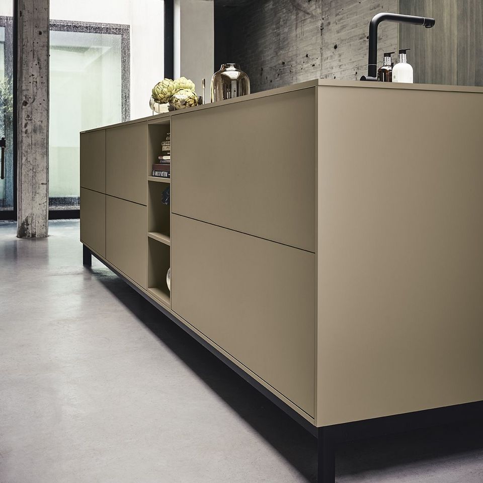 Die unifarbene Kochinsel in Saharabeige scheint auf ihren Füßen beinahe zu schweben. In ihrer grifflosen Ausführung wirkt sie wie ein minimalistisches Objekt.